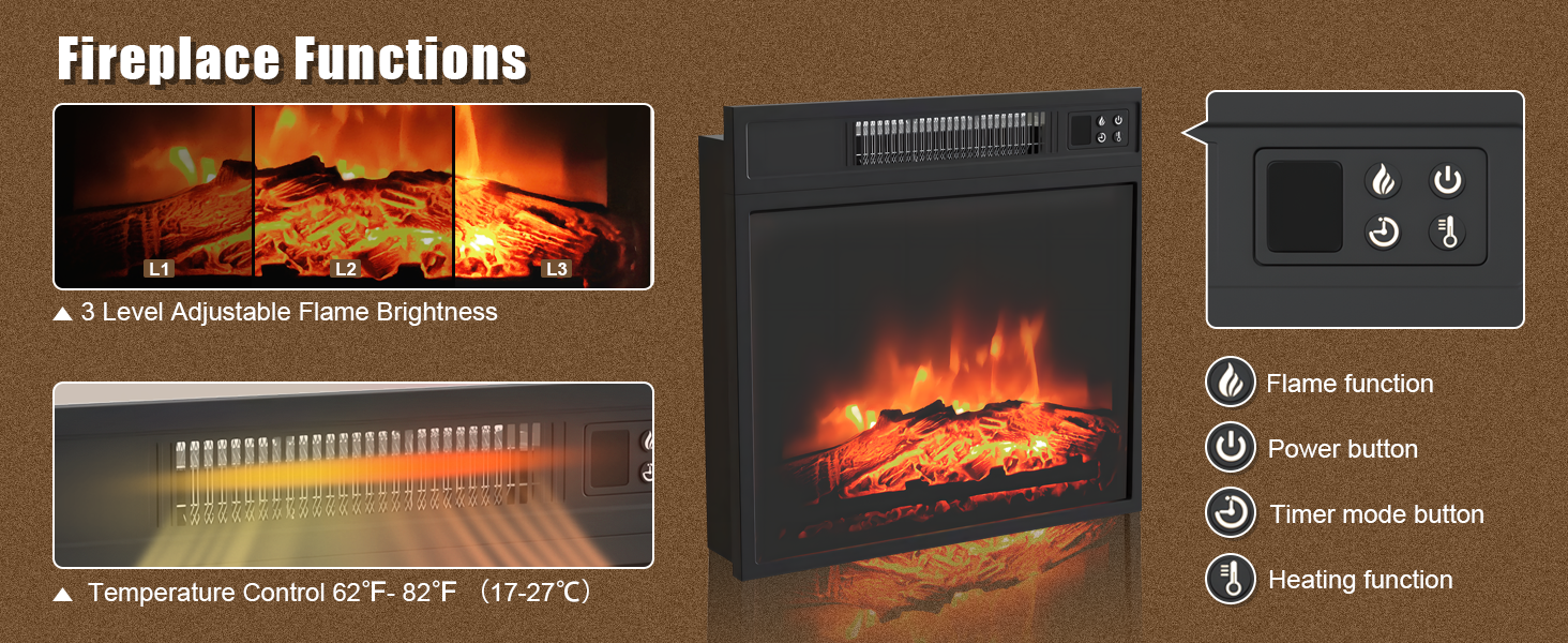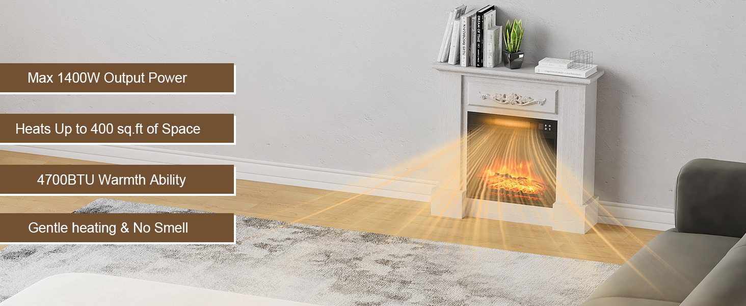 - Powerful Heating: Equipped with an 18" freestanding 1400W electric fireplace, this unit can efficiently heat spaces up to 400 sq ft, ensuring a warm and cozy environment. It's the perfect electric fireplace for the living room or any space in need of warmth.