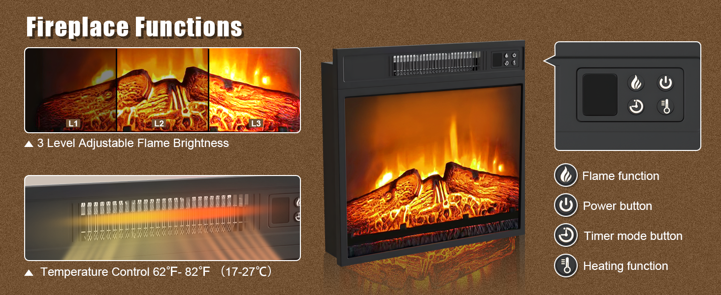 - Realistic Fireplace Effect: Enjoy the cozy ambiance of fireplace with this electric unit, featuring mesmerizing dancing flames and three adjustable brightness levels.